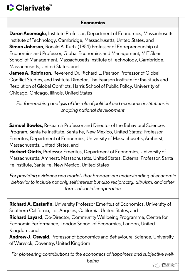 另一组2022年Clarivate经济学引文桂冠奖得主是鲍尔斯(Bowles)和金迪斯(Gintis)。参见《走向统一的社会科学 | 翻书党人札记》。Samuel Bowles, Research Professor and Director of the Behavioral Sciences Program, Santa Fe Institute, Santa Fe, New Mexico, United States; Professor Emeritus, Department of Economics, University of Massachusetts, Amherst, Massachusetts, United States, and