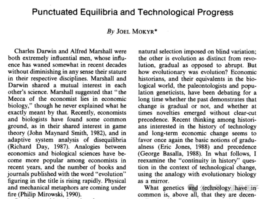 莫基尔1990年在《美国经济评论(American Economic Review)》的短文《Punctuated equilibria and technological progress》就试图解释技术进步到底是“涓涓细流的水到渠成”还是“突如其来的间断均衡”的?理论上技术进步应该是一个连续缓慢的过程,涓涓细流汇成大河。但现实的观察是经济增长往往是由少数几次巨大的颠覆性的技术进步造成的,例如蒸汽机和电力。