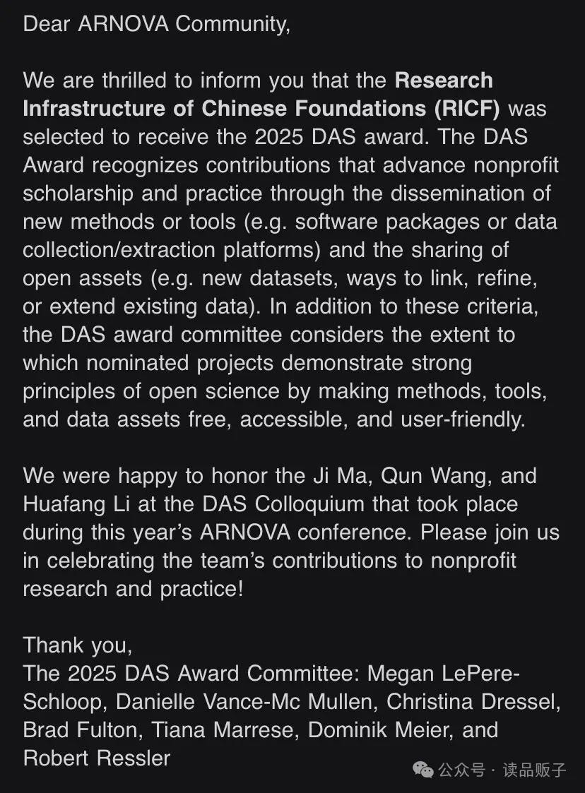 另外要提一下,马季,王群,董超和我之前做的RICF这个数据,获得了2025年Association for Research on Nonprofit Organizations & Voluntary Action (ARNOVA)的 Data & Analytics Section (DAS) Award。这个免费公开的数据库已经被40多项研究引用,算是我们为学界做的一项功德四十几的服务了。