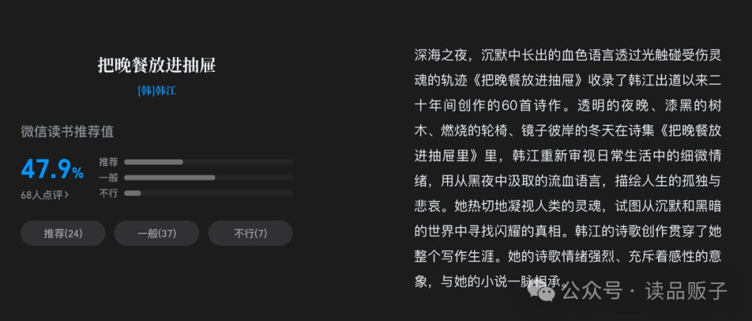 我看了一下微信读书对韩江诗集的评价,68个人里,37个人觉得一般,还有7人觉得不行。就欣赏品味而言,纯粹我个人的看法,那就是这37人品味一般,还有7人品味不行。